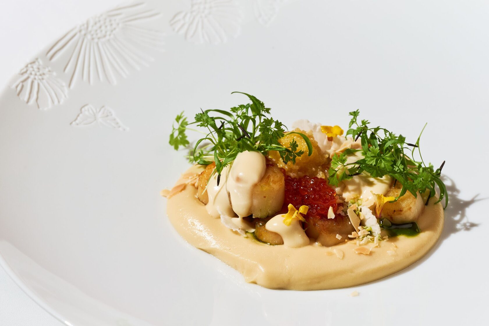 Блюда зала Чароит походят на произведения искусства — севиче из креветок Ама Эби с понзу и малиной или гребешок с пюре из цветной капусты на миндальном молоке с икрой и соусом берблан. В финале ужина предлагаем по-новому взглянуть на десерты — шеф-кондитер Анастасия Сундеева сделала совершенно невесомые весенние композиции.