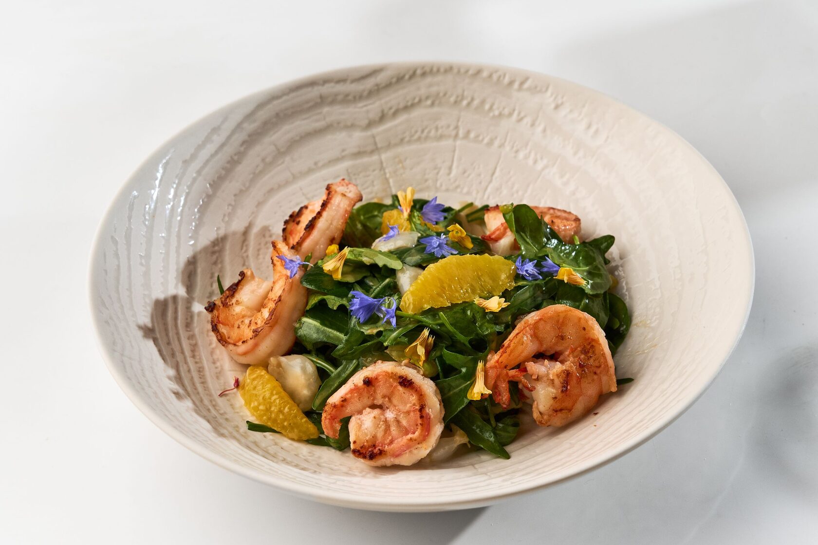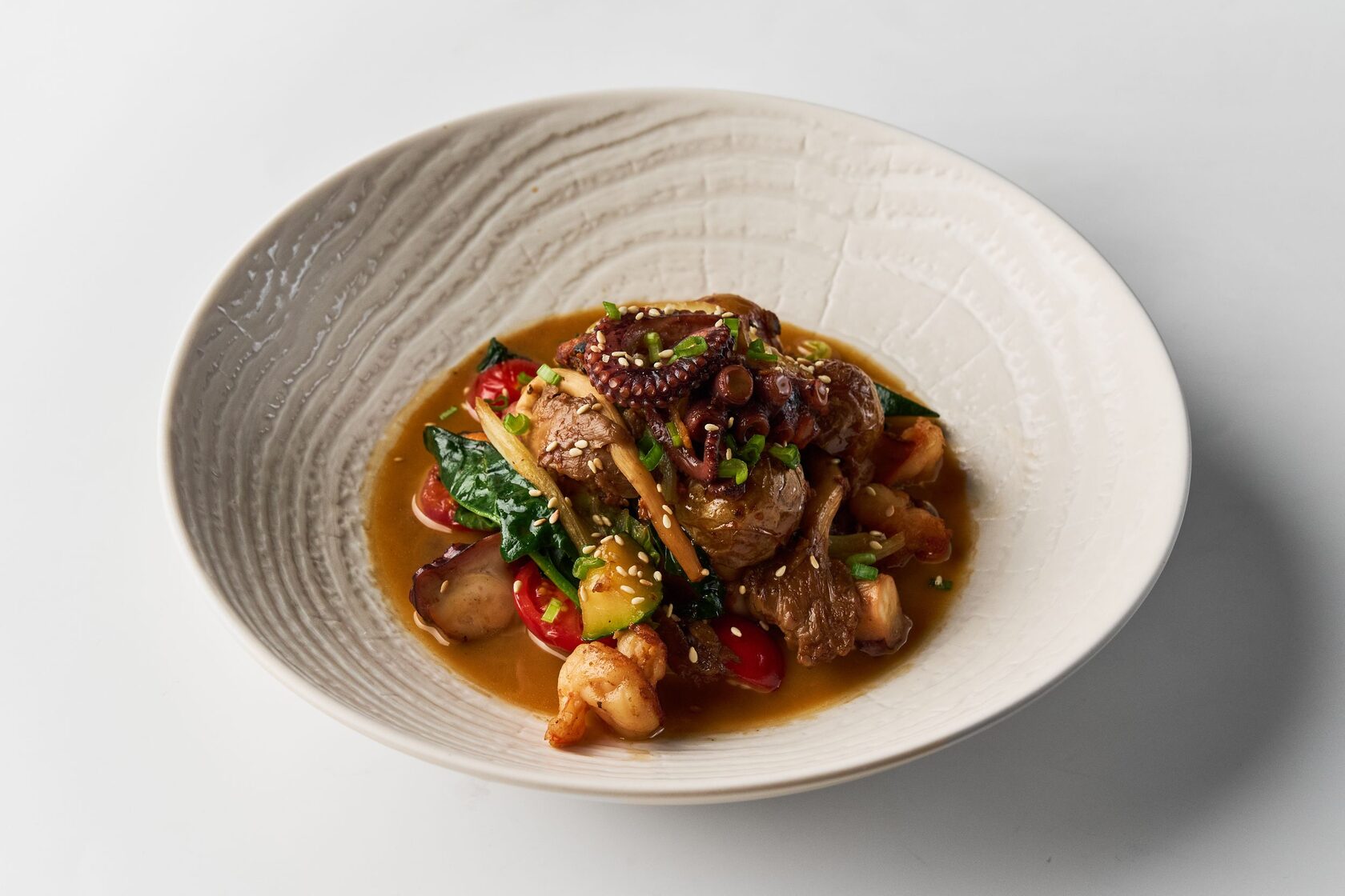 В зале Минералы подаем щедрую порцию микс салата с креветками и грейпфрутовой заправкой, нежный тар-тар из лосося с авокадо и зеленым яблоком, наваристую дальневосточную уху с водорослями и соте из осьминога с морепродуктами.